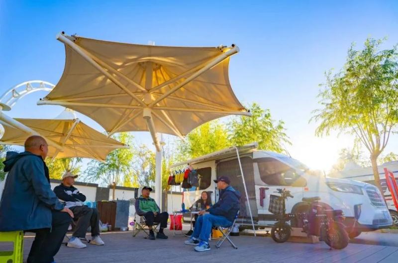 在額濟(jì)納旗居延驛站,不少自駕游旅客搭起帳篷、支起飯桌,三五好友圍坐在一起,盡情探索“露營+”新玩法。旅游旺季期間,居延驛站全力保障車位供給,配備完善的水電系統(tǒng),著力提升游客體驗感?!斑@里不僅風(fēng)光獨(dú)特,而且旅游設(shè)施完善、服務(wù)周到,真是不虛此行?!眮碜陨虾5摹澳β冒l(fā)燒友”云楓連連稱贊。