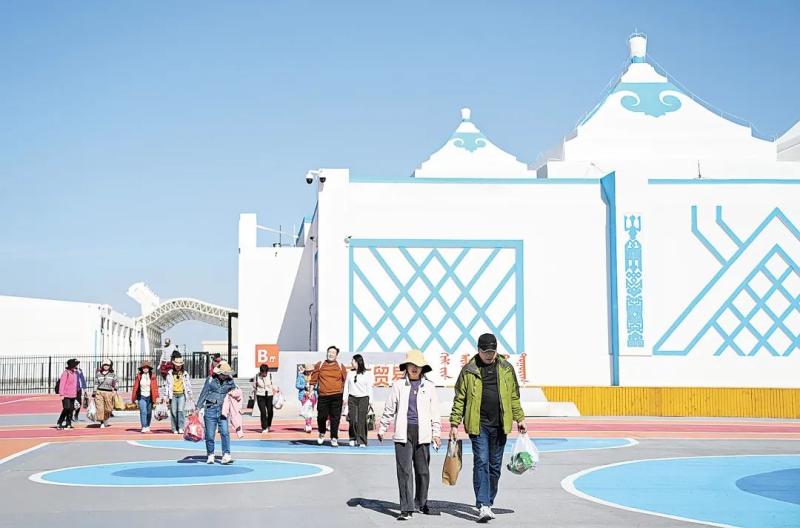 雄偉的策克口岸國門東側,是一排排商業(yè)區(qū),商店、飯店、文化設施等一應俱全,假日里游客眾多,熱鬧非凡;國門西側,一座座形似蒙古包的白色建筑整齊排列,這就是中蒙邊民互市貿(mào)易區(qū)。策克口岸工作人員張銳介紹,自2014年起,經(jīng)過持續(xù)建設與完善,中蒙邊民互市貿(mào)易區(qū)逐步成形。依托這一平臺,口岸常態(tài)化舉辦特色商品展會,聚集了人氣,帶動了邊境旅游。