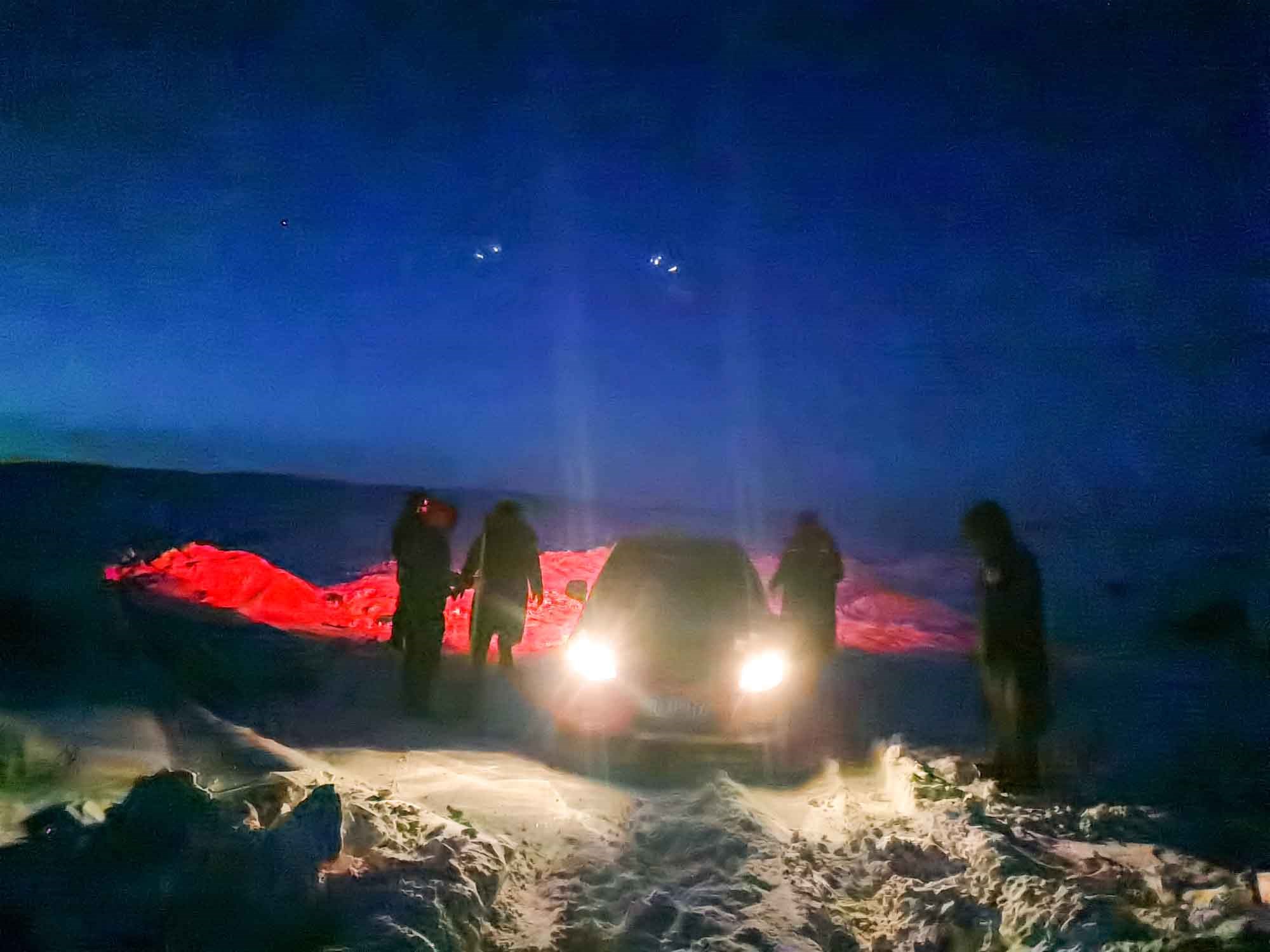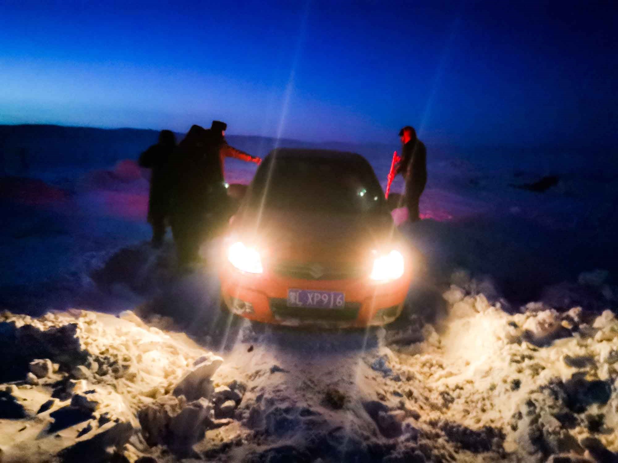 1月17日17時,那木吉拉與弟弟一同駕車返回百靈廟鎮(zhèn),在途經一處被風谷地時,由于晚上視線較差,且此處坡度較大,不慎陷入雪中無法動彈,只得撥通電話請求派出所救助。草原上沒有遮蔽物,常常到了下午就刮起大風,吹得積雪覆蓋在土地上分不清地勢高低,民警們按著平日下鄉(xiāng)走訪的經驗摸索前進,經過近一小時才到達現(xiàn)場,了解情況后,民警們將準備好的熱水和棉大衣遞給牧民便展開了救援工作。在零下35度的冬夜里,民警們用鐵鍬和雙手經過近兩個小時的奮戰(zhàn)終于將40厘米厚的積雪清理干凈,并將被困車輛通過前拉后推的方式移至平坦區(qū)域。