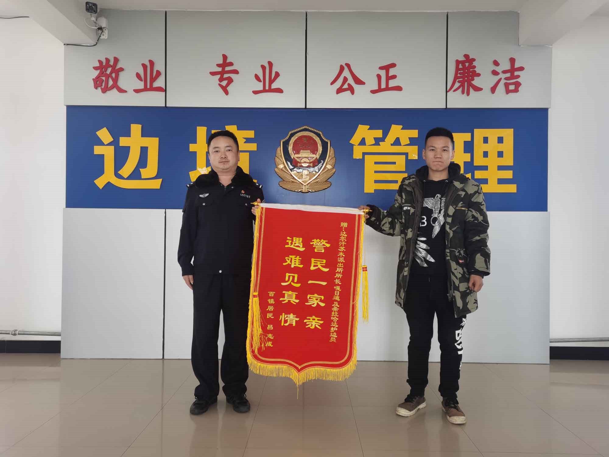 “民警同志太感謝你們了,有你們在我們就感覺安心多了。”1月19日早晨,內蒙古包頭市達茂旗達爾罕蘇木牧民那木吉拉“嘎吱嘎吱”的踩著潔白的積雪走進包頭邊境管理支隊達爾罕邊境派出所,一邊說著一邊拿出印有“警民一家親,遇難見真情”的錦旗遞給民警。