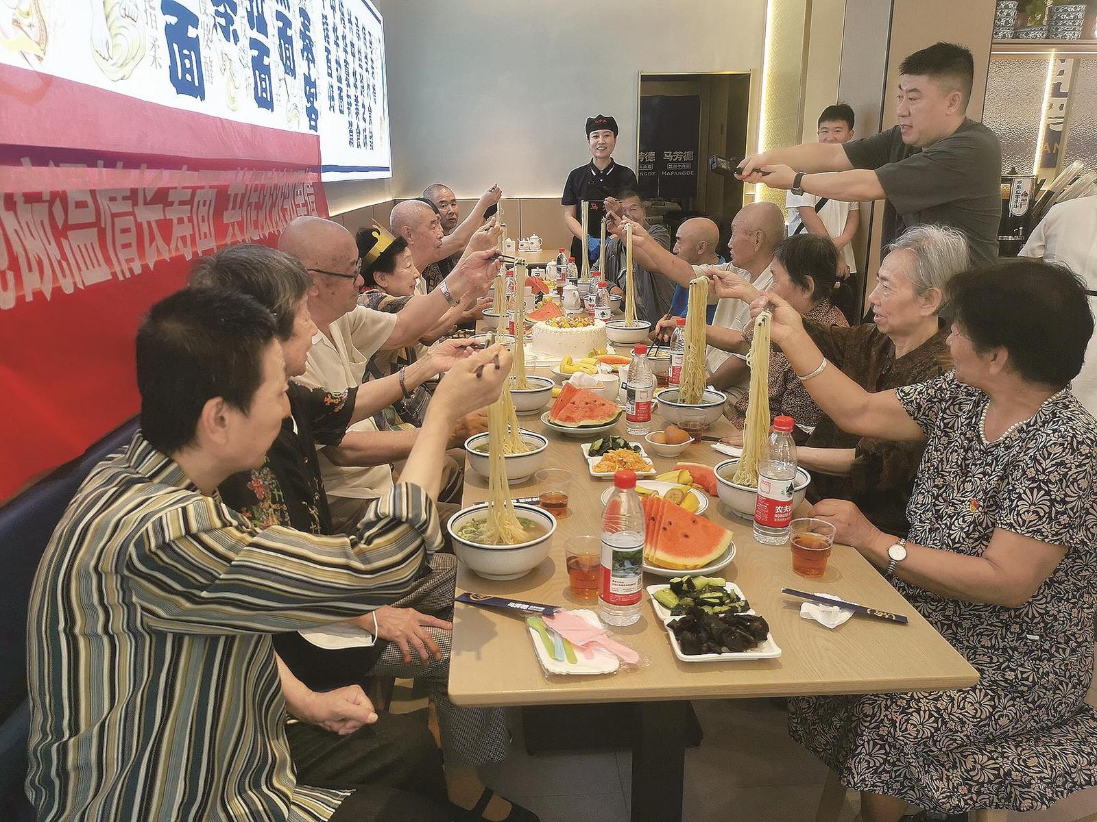 老人們舉起筷子感受長壽面的溫暖。