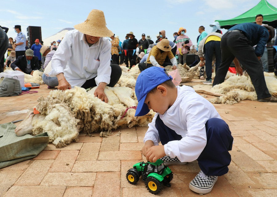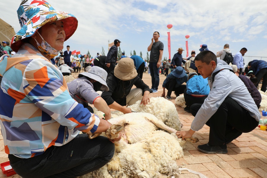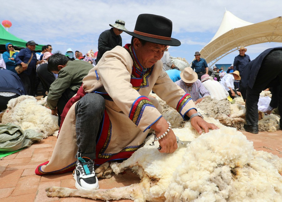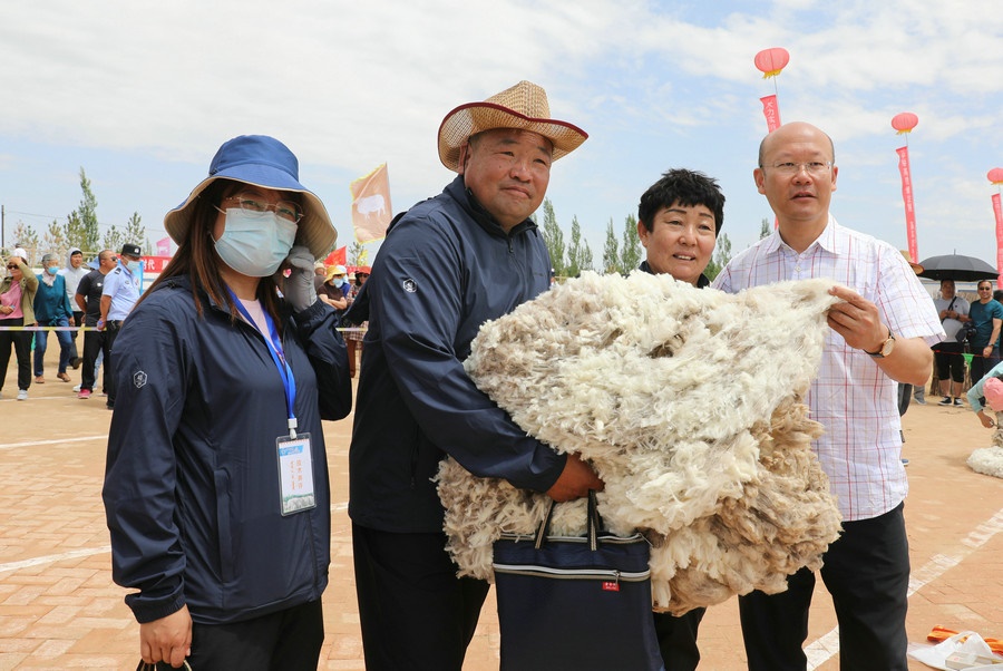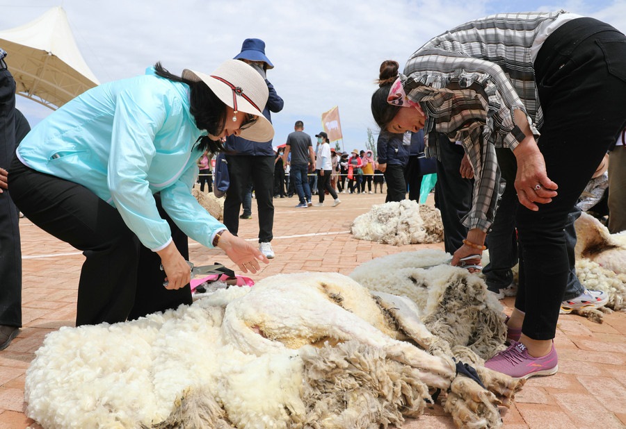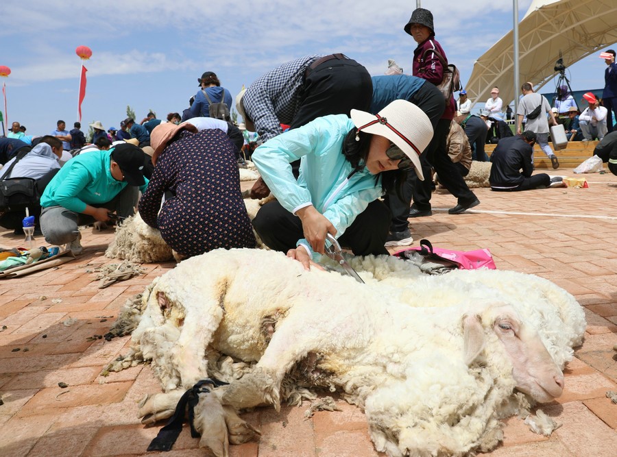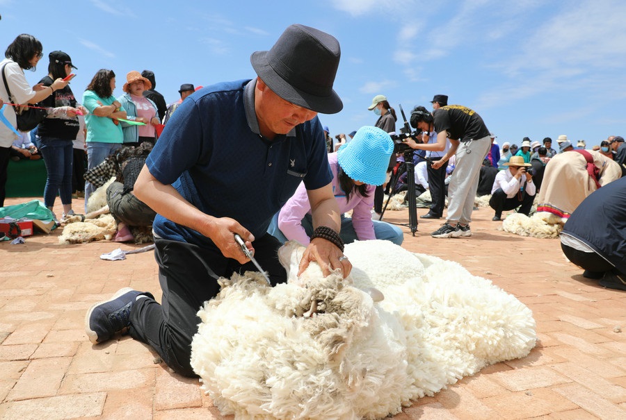在同步舉行的剪羊毛大賽中,參賽選手們用剪刀和電動剪毛機,在細(xì)毛羊身上翻飛操作,牧民們熟練的身手和精湛的技藝,使一只只羊片刻之間“脫胎換骨”。