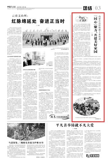 2025年12月2日,《中國民族報》第3版刊發(fā)題為《內(nèi)蒙古達拉特旗工業(yè)街道:“同心”聚力,共建美好家園》的文章,報道了內(nèi)蒙古達拉特旗工業(yè)街道以“同心共建、同心共學(xué)、同心共事、同心共樂”的“四心四共”工作法賦能基層治理。打造“同心向暖·花開工業(yè)”民族工作品牌,將民族團結(jié)融入基層治理各環(huán)節(jié),奏響了開放包容、融榮共居的和諧樂章。