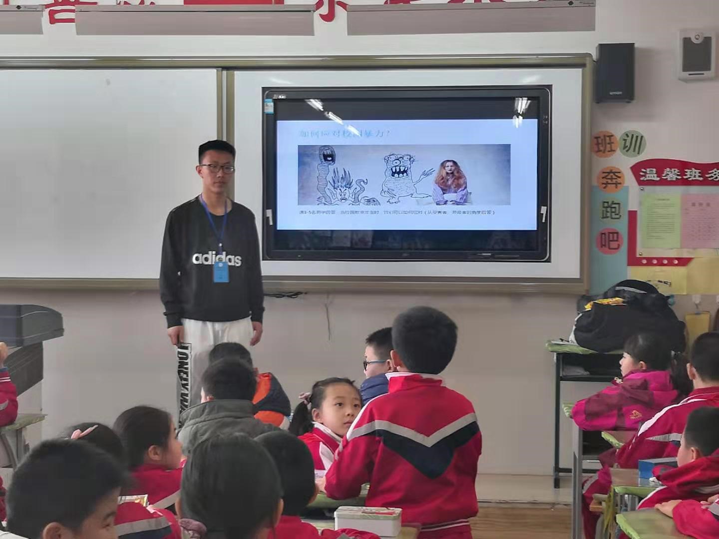 只見一個長相魁梧的“歹徒”不僅擋住同學(xué)們回家的路,還口出狂言。而路過的幾名同學(xué)正不知所措。原來這是由北垣小學(xué)的師生們正在進(jìn)行校園暴力演習(xí),且當(dāng)天還邀請了52位律師走進(jìn)校園,為同學(xué)們上了一堂生動的法律常識課。