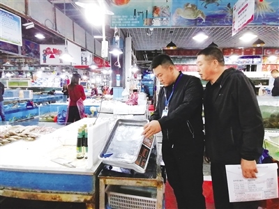 執(zhí)法人員檢查海鮮市場內(nèi)的電子秤