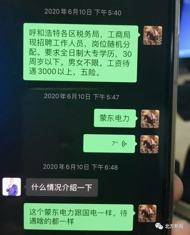 “呼和浩特各區(qū)消防大隊招聘辦公室內(nèi)勤人員,工資待遇3500元左右。”“高速交警呼市支隊(一支隊)輔警,工資和五險一金,4200元。”“呼和浩特各區(qū)稅務(wù)局、工商局現(xiàn)招聘工作人員,崗位隨機分配?!薄昂艉秃铺貗D幼保健院招聘護士,大專學(xué)歷”……記者在民警繳獲的程某某的手機上看到,6月8日以來,程某某和趙某某的聊天記錄中,發(fā)送了多條諸如此類的招聘信息。