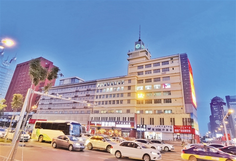 當(dāng)日傍晚時分,天色漸暗,華燈初上,在斑斕的霓虹燈中,街道車水馬龍,人群熙熙攘攘,一派繁華都市的景象。這座建于1983年的景觀塔鐘,依然和30多年前一樣屹立在新華廣場東側(cè)的信息大廈樓頂,再次以“地標(biāo)”姿態(tài)工作起來。