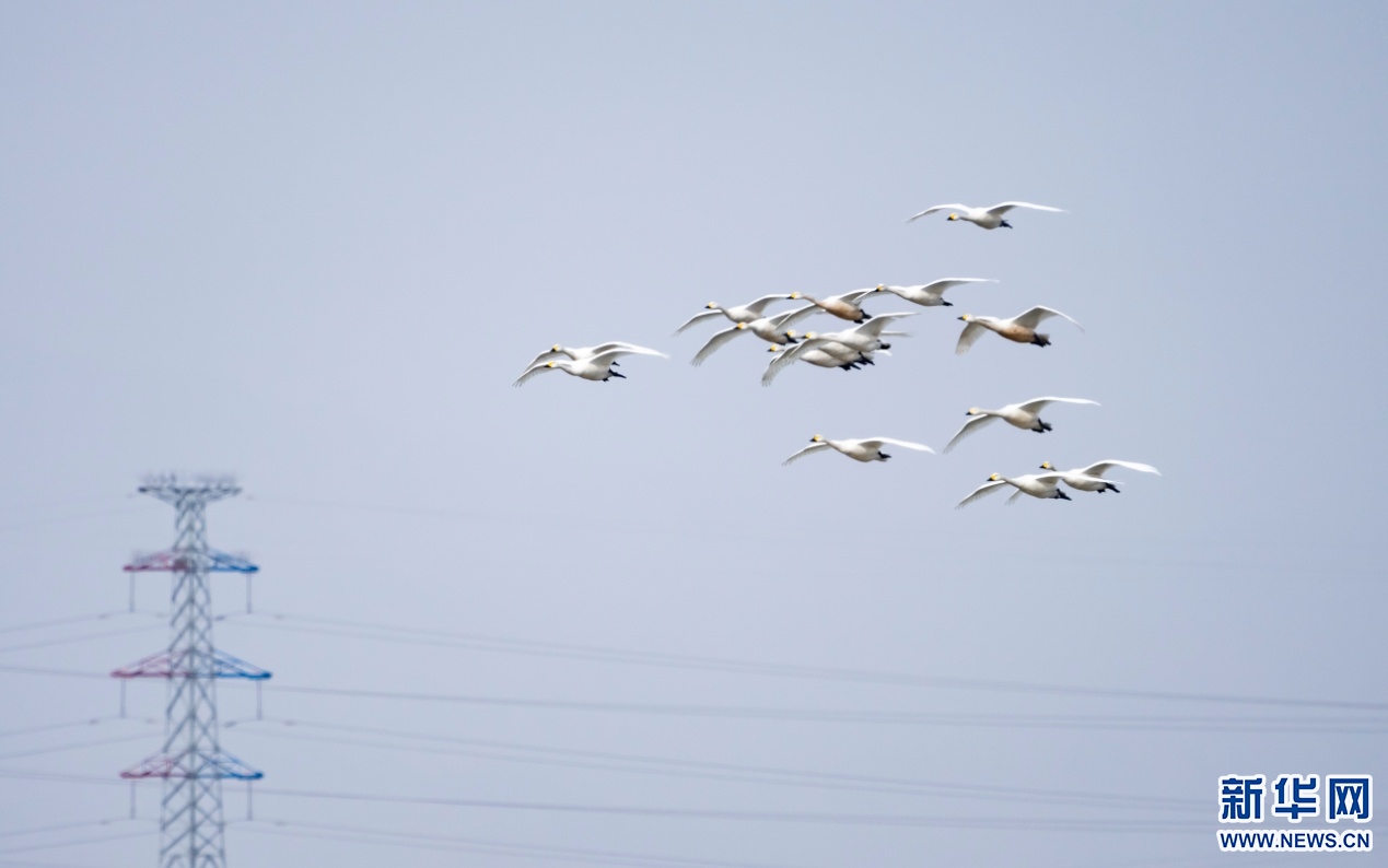 成群的天鵝在土默特左旗海流水庫上空飛翔。新華網發(fā)(陽光 攝)