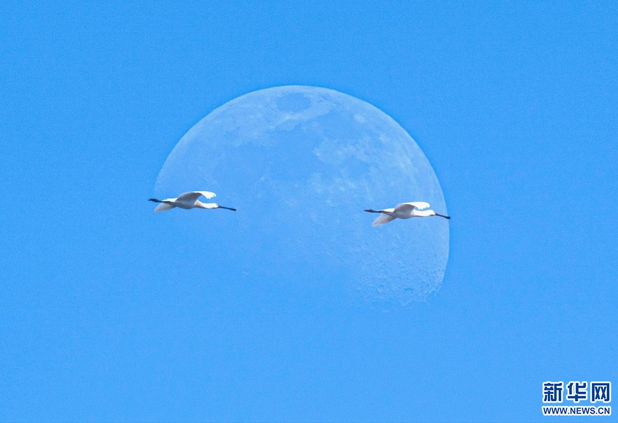 兩只候鳥在內蒙古自治區(qū)土默特左旗海流水庫上空飛翔。新華網發(fā)(楊鑫 攝)