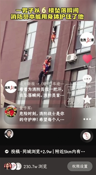 朱先生目睹了整個救援過程,他告訴記者:“那名男子坐在窗戶外沿,搖搖欲墜。雖然是6樓,但這是寫字樓,復式結(jié)構,相當于普通住宅10樓的高度,非常危險!就在墜落瞬間,消防員本能地用自己身體護住了他!為他們點贊!”