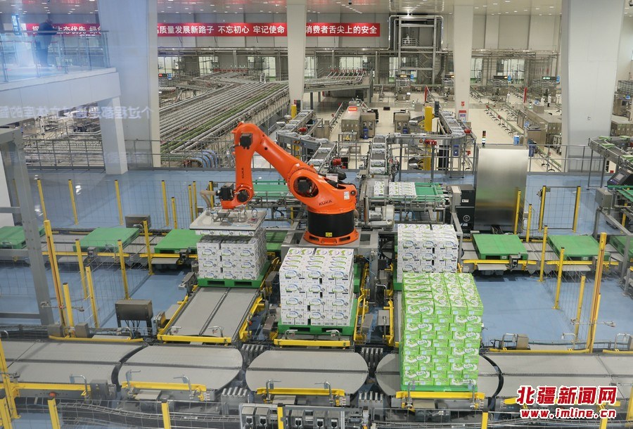 車間內(nèi)一派繁忙,液奶、奶粉生產(chǎn)線在高效運(yùn)轉(zhuǎn),貼管、分包、裝箱等工序一氣呵成,數(shù)字工廠、無(wú)菌車間、智能監(jiān)控等處處體現(xiàn)著現(xiàn)代化、智能化、生態(tài)化。