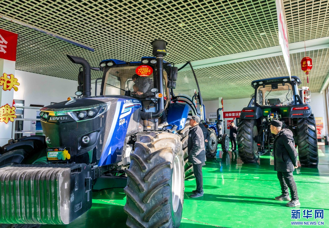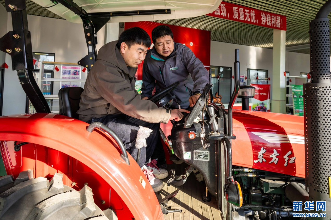 ??2月18日,在位于呼和浩特市玉泉區(qū)的一家農(nóng)機設(shè)備公司展銷大廳,農(nóng)戶在咨詢選購拖拉機。新華網(wǎng)發(fā)(丁根厚 攝)