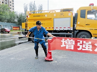在這之前,通遼市排水管理處已啟動(dòng)應(yīng)急預(yù)案,搶險(xiǎn)人員及應(yīng)急搶險(xiǎn)車輛陸續(xù)就位。負(fù)責(zé)明仁立交橋排水搶險(xiǎn)的第2小組的4名成員兵分兩路,需要?jiǎng)裢藮|、西兩側(cè)準(zhǔn)備過橋的汽車司機(jī)和行人,以及排布車輛、施拉警界線……橋西邊,污水管道維護(hù)隊(duì)車隊(duì)隊(duì)長張?jiān)僦沁吤χ掷锏幕顑?,邊通過對(duì)講機(jī)呼叫副隊(duì)長盛博,催促他趕緊向過往的車輛及行人喊話,提醒大家橋下水深不能通行。此時(shí),盛博已駕車由西向東行至立交橋南側(cè)的輔路上,雨水遮住了視線,雨刮器速度越來越快,他邊回應(yīng)張?jiān)僦?,邊放慢車速向人們喊話?/p>