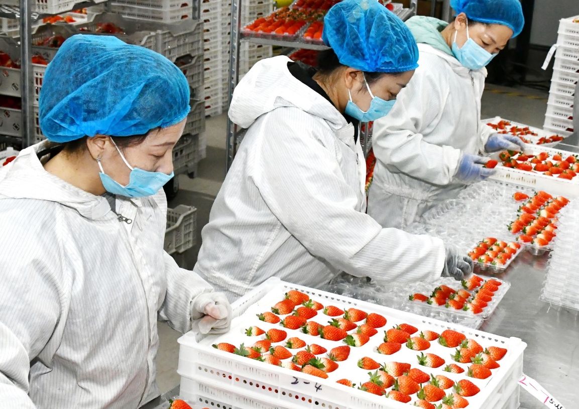一盒盒新鮮草莓正在裝箱,準(zhǔn)備運(yùn)往各地。 張曉鵬 攝