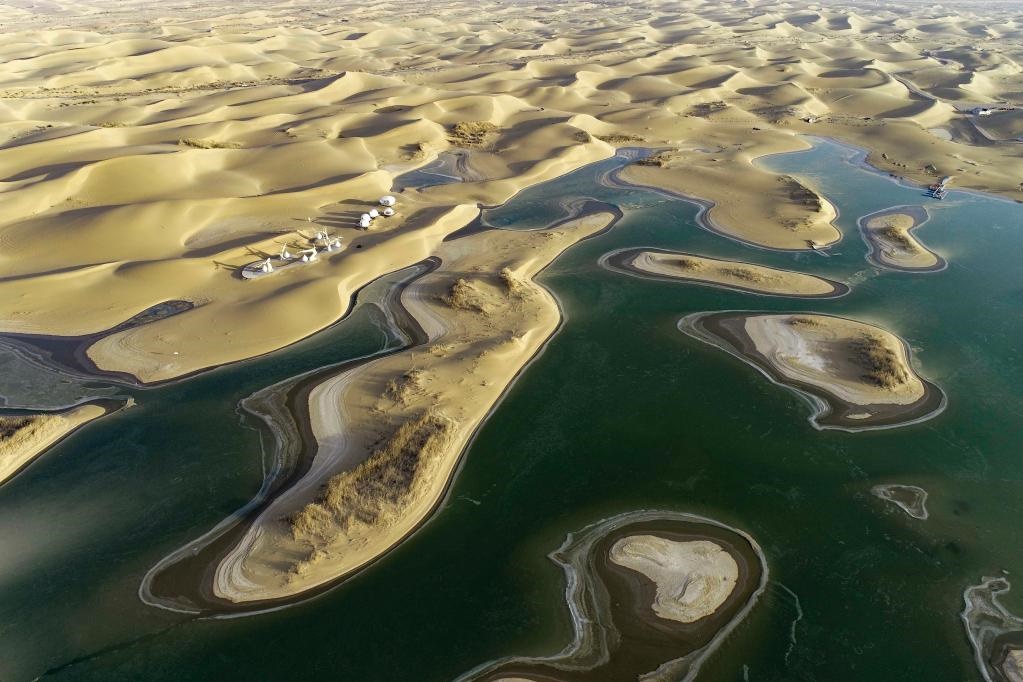 烏海湖由黃河海勃灣水利樞紐蓄水形成,總面積約118平方公里,湖水西接烏蘭布和沙漠,形成眾多各具特色、千姿百態(tài)的沙島,呈現(xiàn)出半湖碧水半湖沙的美麗景色。新華社發(fā)(王正 攝)