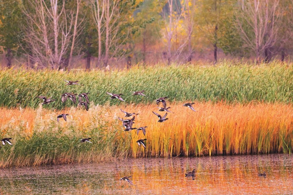 沿著黃河岸邊的公路前行,不遠(yuǎn)處便是龍游灣國家濕地公園。這里的秋景更是別有一番風(fēng)味。樹木褪去了翠綠,換上了耀眼的金黃,廣袤的田野里,一捆捆草垛錯落有致地散布在草地上,訴說著豐收的喜悅。遠(yuǎn)處的蘆葦蕩與天際線相連,蘆葦花在風(fēng)中輕舞,時而聚攏、時而散開,與水面上掠過的水鳥構(gòu)成靈動的剪影。林間的候鳥也多了起來,一群群白鷺在水面上盤旋,偶爾俯沖下去,叼起一條小魚,然后又展翅飛向遠(yuǎn)方,給這片寧靜的濕地增添了幾分生機(jī)與活力。