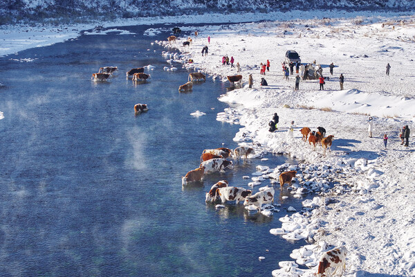 冬日的阿爾山國家森林公園不凍河,在陽光的照耀下輕盈的霧氣裊裊升起,悠閑的牛群在河中咀嚼著鮮美的水草。而那些露出水面的石頭,在寒冷的空氣中被霜花覆蓋如帽,毛茸茸、一團(tuán)一團(tuán)的霜花散落在水中。這如詩如畫的景象,吸引了眾多游客前來觀賞。他們紛紛駐足河岸,拿出相機(jī)和手機(jī),競相捕捉稍縱即逝的美好瞬間。(記者 畢力格 攝)