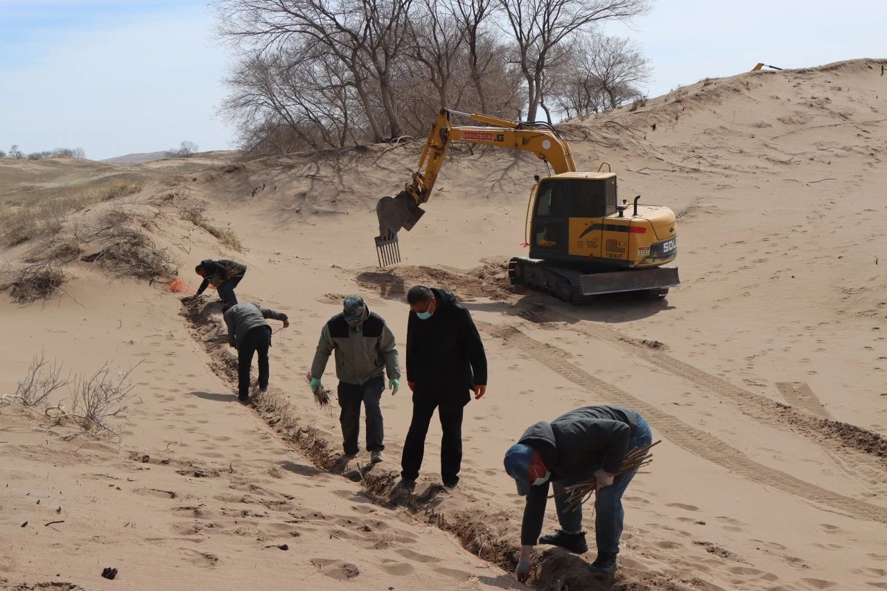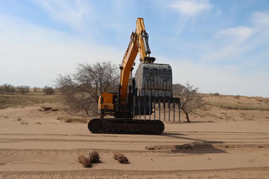 據(jù)錫林浩特市二蛋牧民養(yǎng)殖專業(yè)合作社負責人介紹,在傳統(tǒng)的沙漠治理作業(yè)中,工人需要手動栽植黃柳等固沙植物。然而,人工種植不僅效率低,勞動強度也大。為突破這一困境,合作社成員經(jīng)過多次試驗,最終決定對挖掘機進行創(chuàng)新改造,加裝叉具,這一巧妙的設計不僅實現(xiàn)了對黃柳種植深度和間距的精準把控,還能有效避免土壤翻動,最大程度地保持了土壤水分,切實保護了沙地的生態(tài)環(huán)境。
