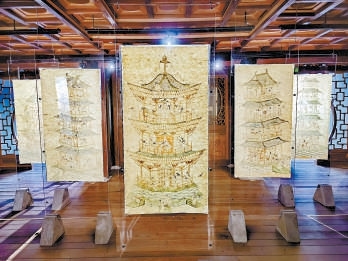 園中一泓池水,清澈如鏡,廊、軒、亭、榭環(huán)繞四周,夾岸有疊石、綠植、繁花,明朗清雅。后樓為展廳,中國(guó)當(dāng)代水墨藝術(shù)家彭薇的作品《有故事的房間》正在展出,觀眾散落其間,駐足欣賞。