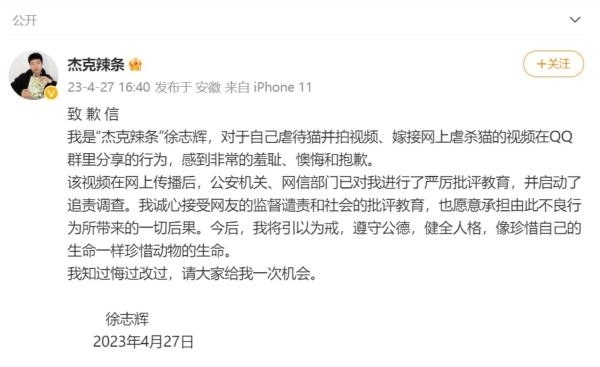 27日16時40分,@杰克辣條 在微博發(fā)表了署名“徐志輝”的致歉信稱,對于自己虐待貓并拍視頻、嫁接網上虐殺貓的視頻在QQ群里分享的行為,感到非常的羞恥、懊悔和抱歉。該視頻在網上傳播后,公安機關、網信部門已對其進行了嚴厲批評教育,并啟動了追責調查。