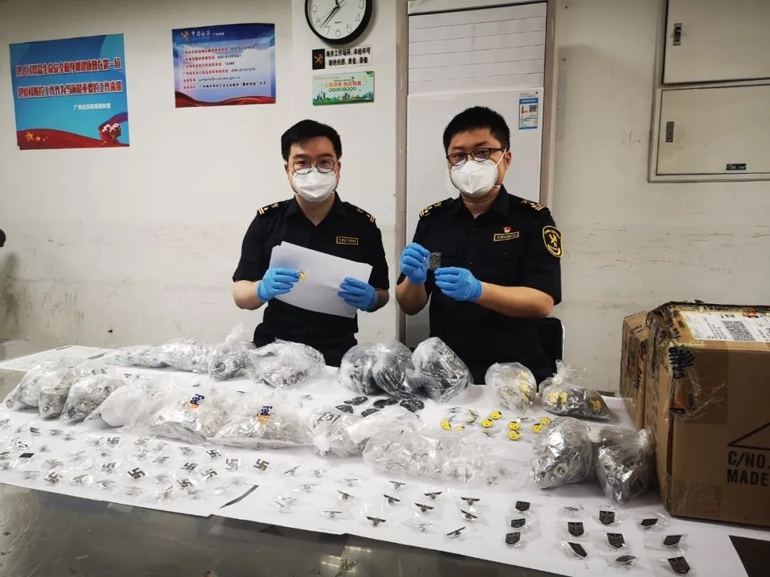 記者5月12日從廣州海關(guān)獲悉,該關(guān)近日在廣州白云機(jī)場(chǎng)空港口岸出境快件渠道查獲一批納粹徽章,共9個(gè)品種、1881枚。目前,已作進(jìn)一步處理。