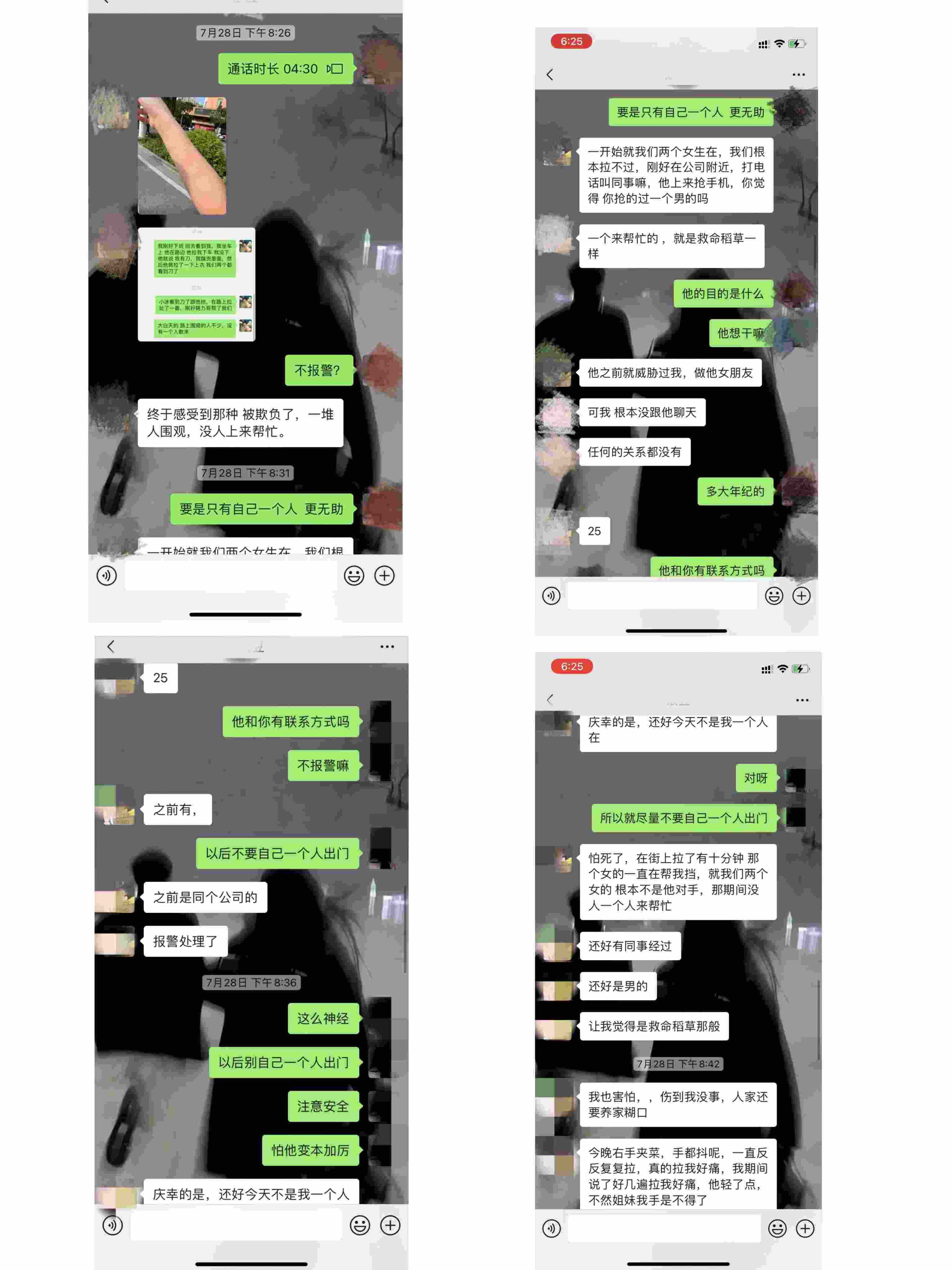 相關聊天截圖顯示,此次被黃某南威脅后,陳某萍和朋友在微信聊天時表示,“報警處理了”。陳某萍還表示,當時,黃某南拉她上衣時,她看到了刀,感到非常害怕,幸好有同事出手相助?!八熬屯{過我,做他女朋友??晌腋緵]跟他聊天,任何關系都沒有?!?/p>