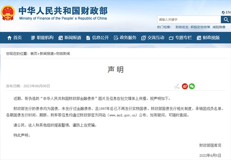 ·財政部發(fā)布聲明:發(fā)行的債券均為國債,未發(fā)行過金融債券。