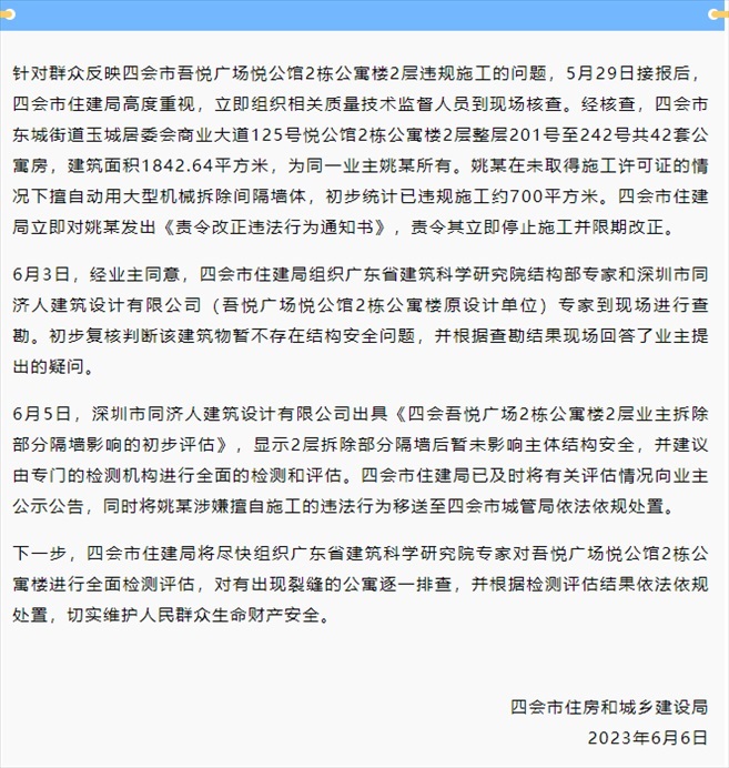 ·業(yè)主買42套房欲打通全部墻體,當(dāng)?shù)赝▓螅贺?zé)令其立即停止施工并限期改正。