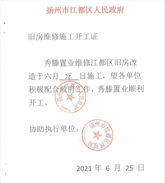 “搞定”西苑社區(qū)后,楊某軍偽造一份《揚州市江都區(qū)人民政府舊房維修施工開工證》,并加蓋“揚州市江都區(qū)人民政府 178962”“揚州市江都區(qū)規(guī)劃局”公章。周女士獲得該證后,立即組織顧先生進場施工。“楊某軍讓我先墊付材料款和人工費,后面等財政撥款就行。我就安排顧先生7月1日進場施工?!?/p>