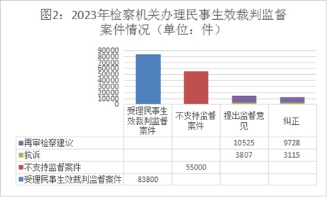 2023年,全國檢察機關(guān)始終堅持以習近平新時代中國特色社會主義思想特別是習近平法治思想為指導(dǎo),認真貫徹落實《中共中央關(guān)于加強新時代檢察機關(guān)法律監(jiān)督工作的意見》,以“高質(zhì)效辦好每一個案件”作為履職辦案的基本價值追求,以專業(yè)化建設(shè)為基礎(chǔ),以提升辦案能力和水平為目標,認真貫徹實施民法典,扎實推進民事生效裁判監(jiān)督、審判活動監(jiān)督、執(zhí)行活動監(jiān)督、支持起訴、虛假訴訟監(jiān)督等各項工作,在完善案卷調(diào)閱制度、民事再審檢察建議制度、促進社會治理等方面取得新進展新成效。