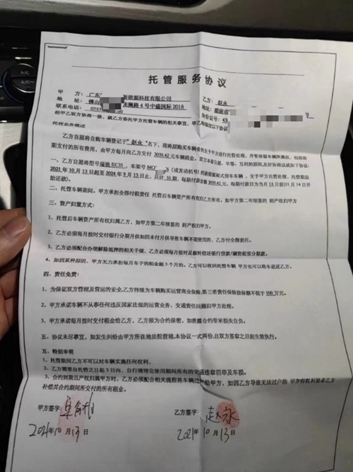 趙永開車來到位于廣東省佛山市的“車管部門”辦理“托管”手續(xù)。托管協(xié)議顯示,車輛由廣東智富卓越新能源科技有限公司托管處理,公司每月給趙永支付租金3000余元。