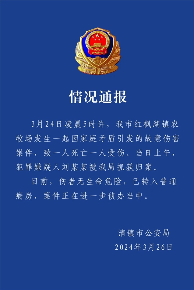 央視網(wǎng)消息:據(jù)貴州清鎮(zhèn)市公安局,3月24日凌晨5時許,清鎮(zhèn)市紅楓湖鎮(zhèn)農(nóng)牧場發(fā)生一起因家庭矛盾引發(fā)的故意傷害案件,致一人死亡一人受傷。