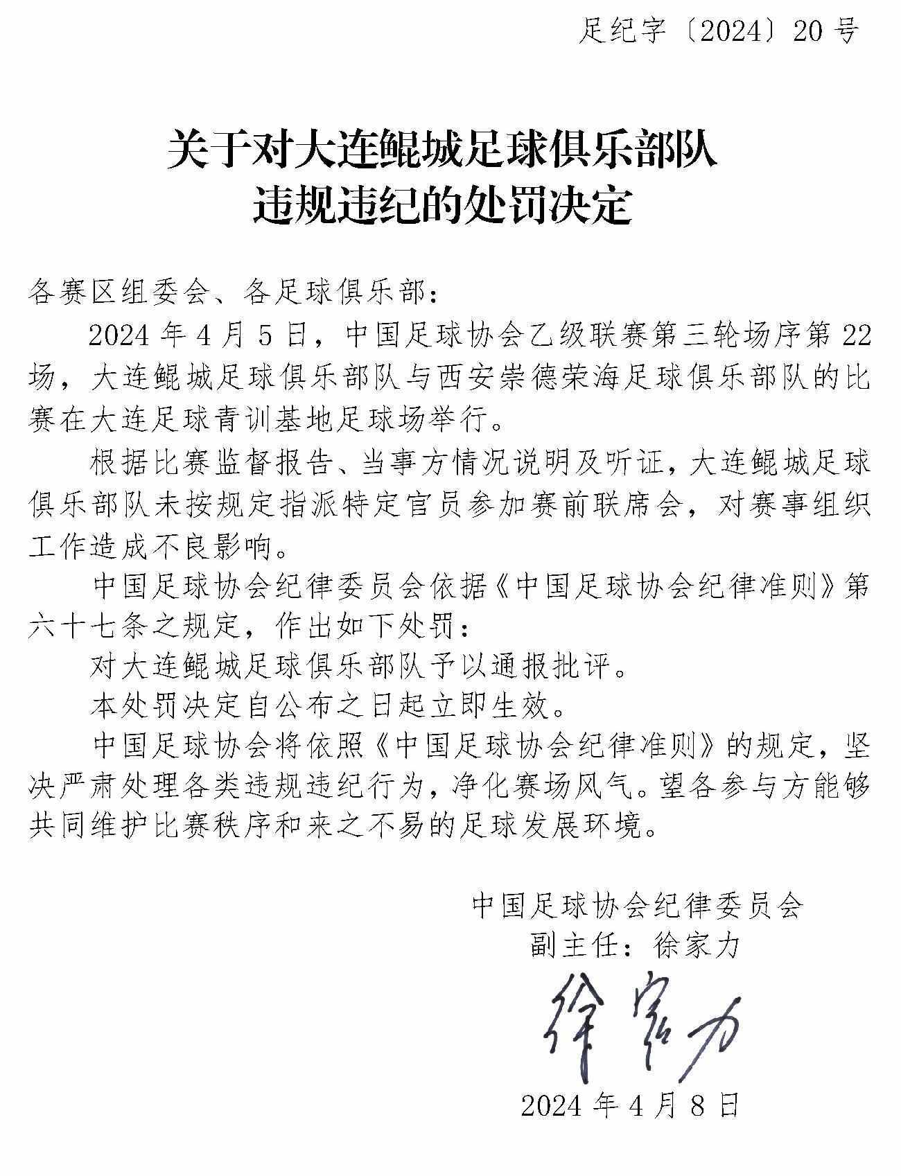 央視網(wǎng)消息:4月10日,中國足協(xié)網(wǎng)站發(fā)布《關(guān)于對(duì)上海嘉定匯龍足球俱樂部隊(duì)球員時(shí)間違規(guī)違紀(jì)的處罰決定》《關(guān)于對(duì)西安崇德榮海足球俱樂部隊(duì)違規(guī)違紀(jì)的處罰決定》《關(guān)于對(duì)大連鯤城足球俱樂部隊(duì)違規(guī)違紀(jì)的處罰決定》三份處罰決定。中甲聯(lián)賽上海嘉定匯龍9號(hào)球員因暴力行為被停賽罰款。中乙聯(lián)賽大連鯤城與西安崇德榮海兩家俱樂部因未按規(guī)定指派特定官員參加賽前聯(lián)席會(huì),被通報(bào)批評(píng)。