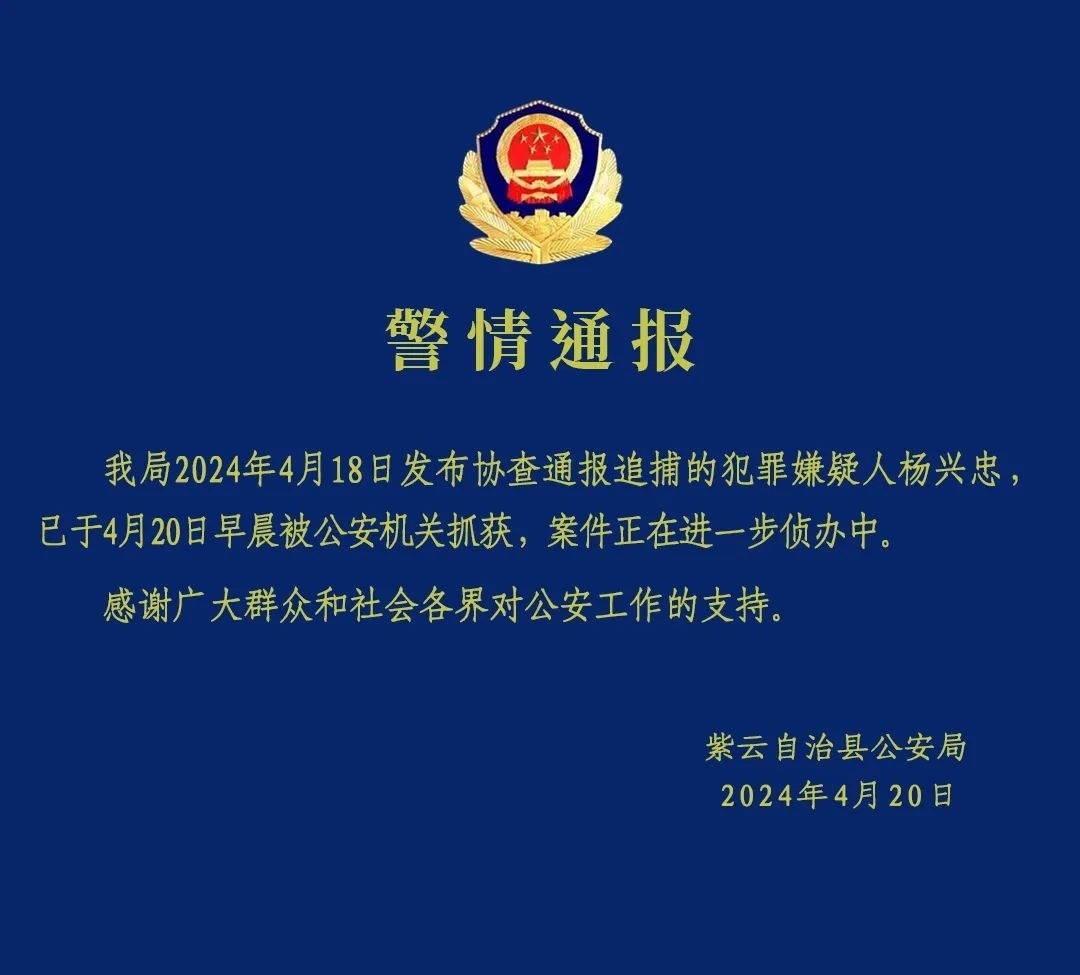 央視網消息:據(jù)“紫云公安”官微消息,紫云自治縣公安局4月18日發(fā)布協(xié)查通報追捕的犯罪嫌疑人楊興忠,已于4月20日早晨被公安機關抓獲,案件正在進一步偵辦中。