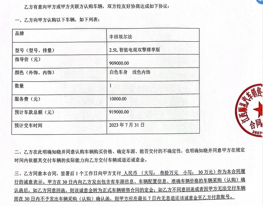 豐田埃爾法汽車,預(yù)計車款總額91.9萬元,其中車輛指導(dǎo)價90.9萬元,服務(wù)費1萬元,預(yù)計交車時間為2023年7月31日。簽訂認(rèn)購合同當(dāng)天,任先生支付了30萬元誠意金。