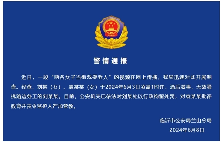 央視網(wǎng)消息:6月8日,臨沂蘭山公安發(fā)布警情通報:近日,一段“兩名女子當(dāng)街戲耍老人”的視頻在網(wǎng)上傳播,我局迅速對此開展調(diào)查。經(jīng)查,劉某(女)、袁某某(女)于2024年6月3日凌晨1時許,酒后滋事,無故騷擾路邊務(wù)工的劉某某。目前,公安機關(guān)已依法對劉某處以行政拘留處罰,對袁某某批評教育并責(zé)令監(jiān)護(hù)人嚴(yán)加管教。