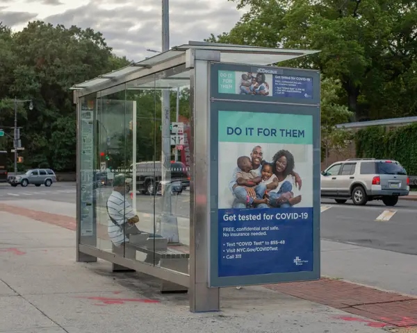 △美國紐約布魯克林一個公交車站的免費核酸檢測廣告 (圖片來源:《紐約時報》)