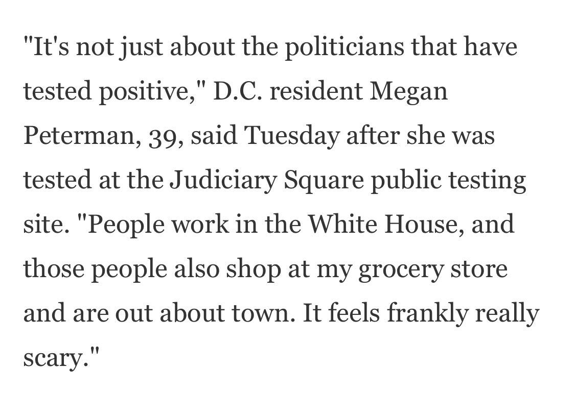 華盛頓居民梅根·彼得曼在當(dāng)?shù)貢r間6日做了核酸檢測,她說:“最近許多白宮官員確診新冠肺炎,白宮工作人員也可能來過我的商店購物,說實話挺嚇人的?!薄 ?/p>
