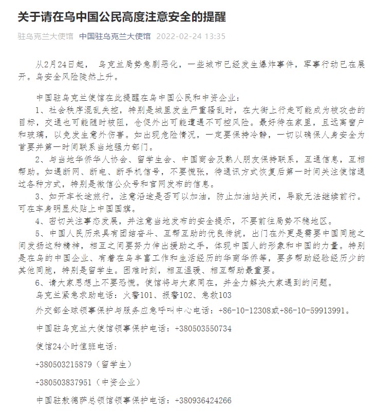 從2月24日起,烏克蘭局勢急劇惡化,一些城市已經(jīng)發(fā)生爆炸事件,軍事行動(dòng)已在展開。烏安全風(fēng)險(xiǎn)陡然上升。