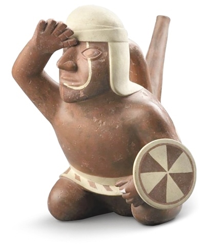 在展廳醒目位置,擺放著一件莫切文明時(shí)期(公元100年—800年)的戰(zhàn)士陶器,他皮膚深褐、高眉大眼、神情堅(jiān)毅,腰間系著白色外衣,頭上戴著布帽。這名戰(zhàn)士身體微微前傾,跪坐在地,左手持盾牌,右手搭于額前,向著遠(yuǎn)方眺望。這件戰(zhàn)士陶器身高雖不足20厘米,卻體態(tài)生動(dòng),僅使用簡(jiǎn)練的線條與棕白兩色,便將一位莫切戰(zhàn)士形象刻畫(huà)得活靈活現(xiàn)。在雷瓜伊文明時(shí)期(公元前200年—公元650年)的動(dòng)物陶器展臺(tái)前,總是有不少孩童圍繞。兇猛的美洲虎、呆萌的羊駝、神秘的未知生物,各種陶器與石器器身僅用黑、紅、白三色裝飾,形態(tài)各異、生動(dòng)活潑,透過(guò)玻璃柜懵懂地望向千年后的小觀眾們。
