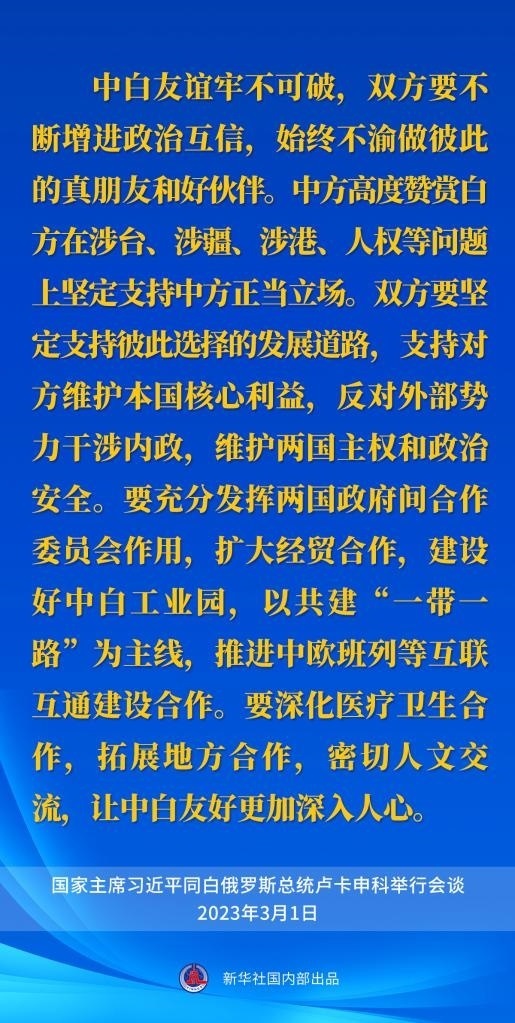 3月1日,國(guó)家主席習(xí)近平在人民大會(huì)堂同來(lái)華進(jìn)行國(guó)事訪問(wèn)的白俄羅斯總統(tǒng)盧卡申科舉行會(huì)談。一起來(lái)看習(xí)近平主席的談話要點(diǎn)。