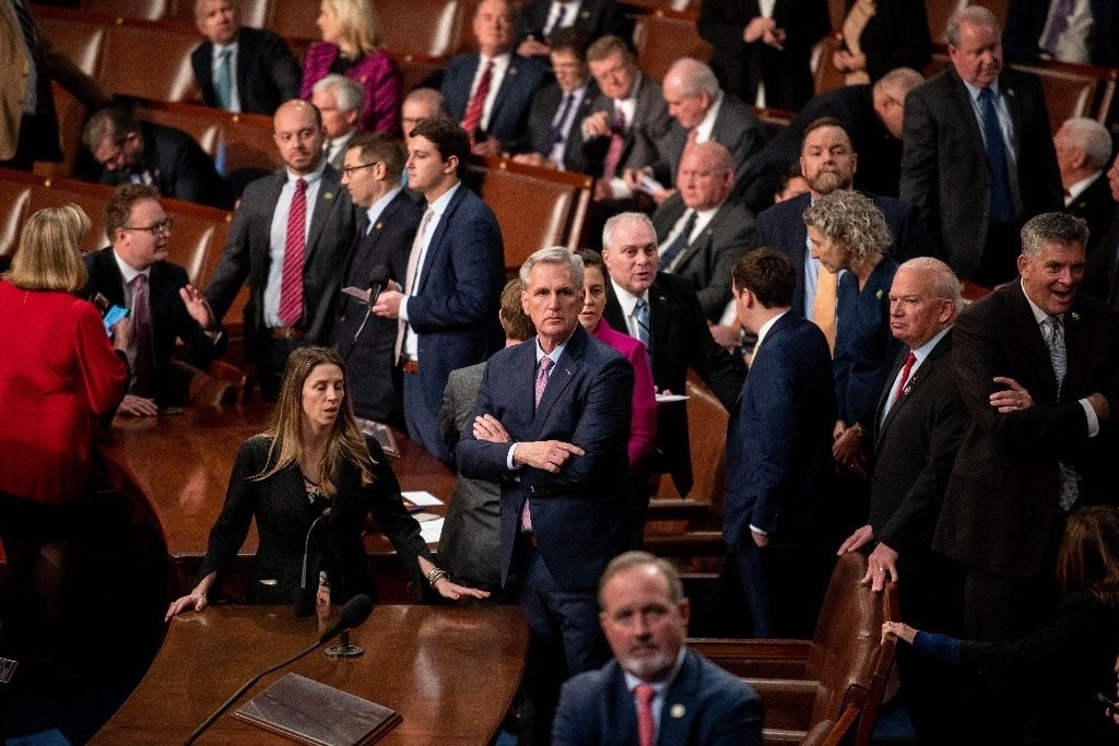 這是1月6日在美國華盛頓國會拍攝的凱文·麥卡錫(中)。經(jīng)過黨內(nèi)激烈爭論達成利益交換,共和黨眾議員凱文·麥卡錫于7日凌晨在第15輪眾議院議長選舉表決中當(dāng)選議長。(新華社記者劉杰攝)