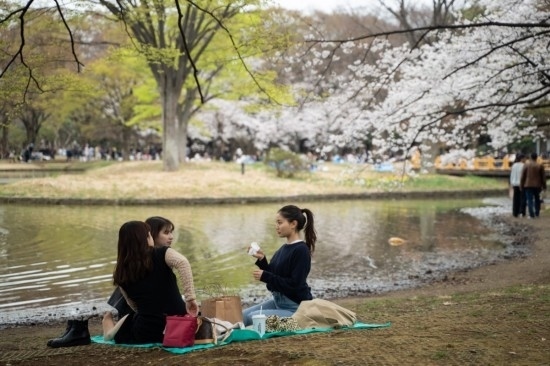 3月21日,人們在日本東京代代木公園野餐休憩。新華社記者張笑宇攝