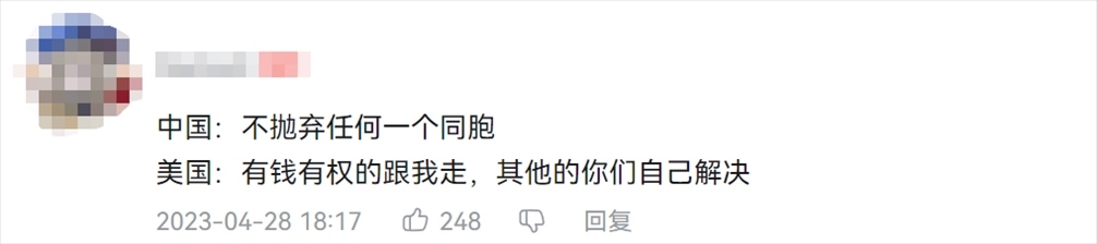 這段視頻引起很多網(wǎng)友的討論,其中有網(wǎng)友簡(jiǎn)單總結(jié)了中美撤僑行動(dòng)的不同?!?/p>