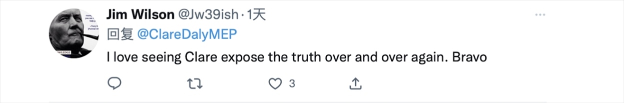 克萊爾·戴利28日在推特上發(fā)布了一條她于19日在歐洲議會全體會議上發(fā)言的視頻,她在視頻上方配文稱,“針對中國可恥的殖民傲慢應該留在過去。問題很簡單。我們是想成為我們大西洋朋友的附庸,還是想與我們最大的貿易伙伴保持和平、獨立的關系?這個伙伴40年來沒有向任何人投過一顆炸彈。”