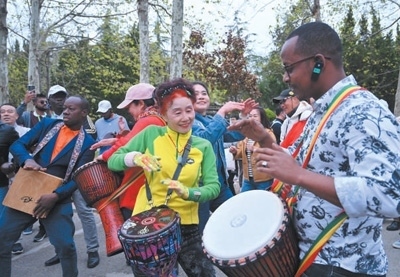 4月22日,在山東青島八大關(guān)街道,非洲青年代表與當(dāng)?shù)厣鐓^(qū)文藝隊(duì)成員熱情互動。本報記者 陳尚文攝