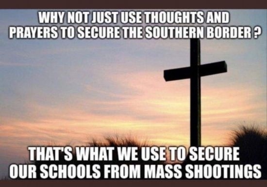 這幅漫畫則諷刺說:“為什么我們不只靠祈禱來阻止非法移民進入美國?我們可是只靠祈禱來保護學校不發(fā)生大規(guī)模槍擊。”