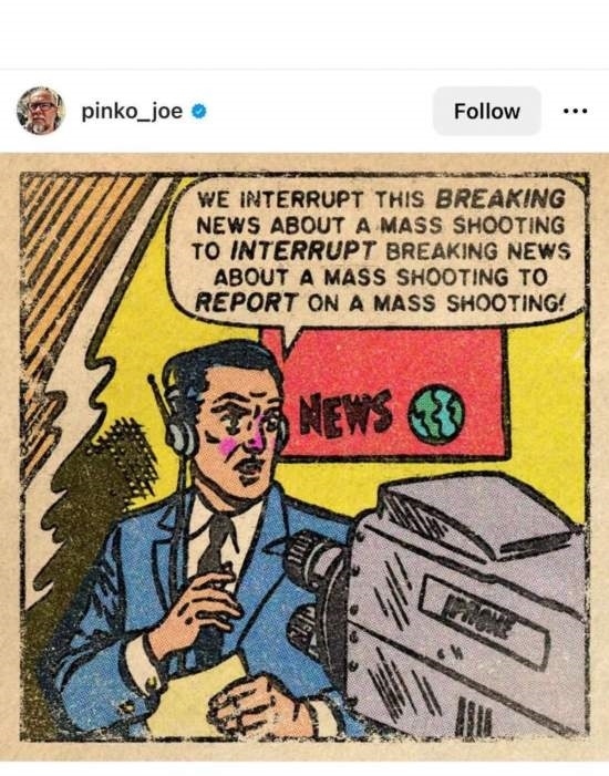 網(wǎng)友Pinko_joe的漫畫主角是一名記者,他對著鏡頭說:“下面讓我們打斷一下關于大規(guī)模槍擊的突發(fā)報道,臨時插播另一條關于大規(guī)模槍擊的突發(fā)新聞!”