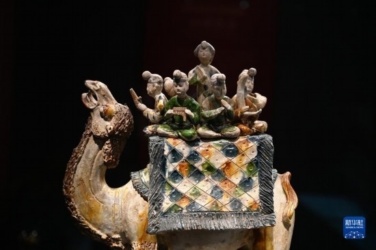 這是在陜西歷史博物館拍攝的唐三彩駱駝?shì)d樂(lè)俑(5月11日攝)。這件唐三彩駱駝?shì)d樂(lè)俑既是唐代文化藝術(shù)、制作工藝發(fā)達(dá)昌盛的重要物證,也見證了絲綢之路上藝術(shù)的交流與融合。