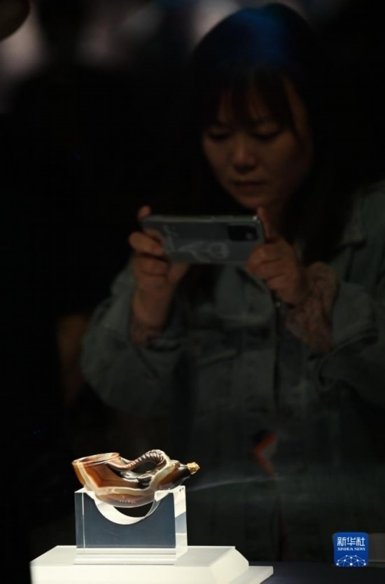 5月11日,游客在陜西歷史博物館參觀鑲金獸首瑪瑙杯。鑲金獸首瑪瑙杯的造型,與起源于古希臘的酒具“來(lái)通”相似,“來(lái)通”曾廣泛流行于中亞、西亞地區(qū),沿著絲綢之路不斷東傳進(jìn)入中國(guó)。